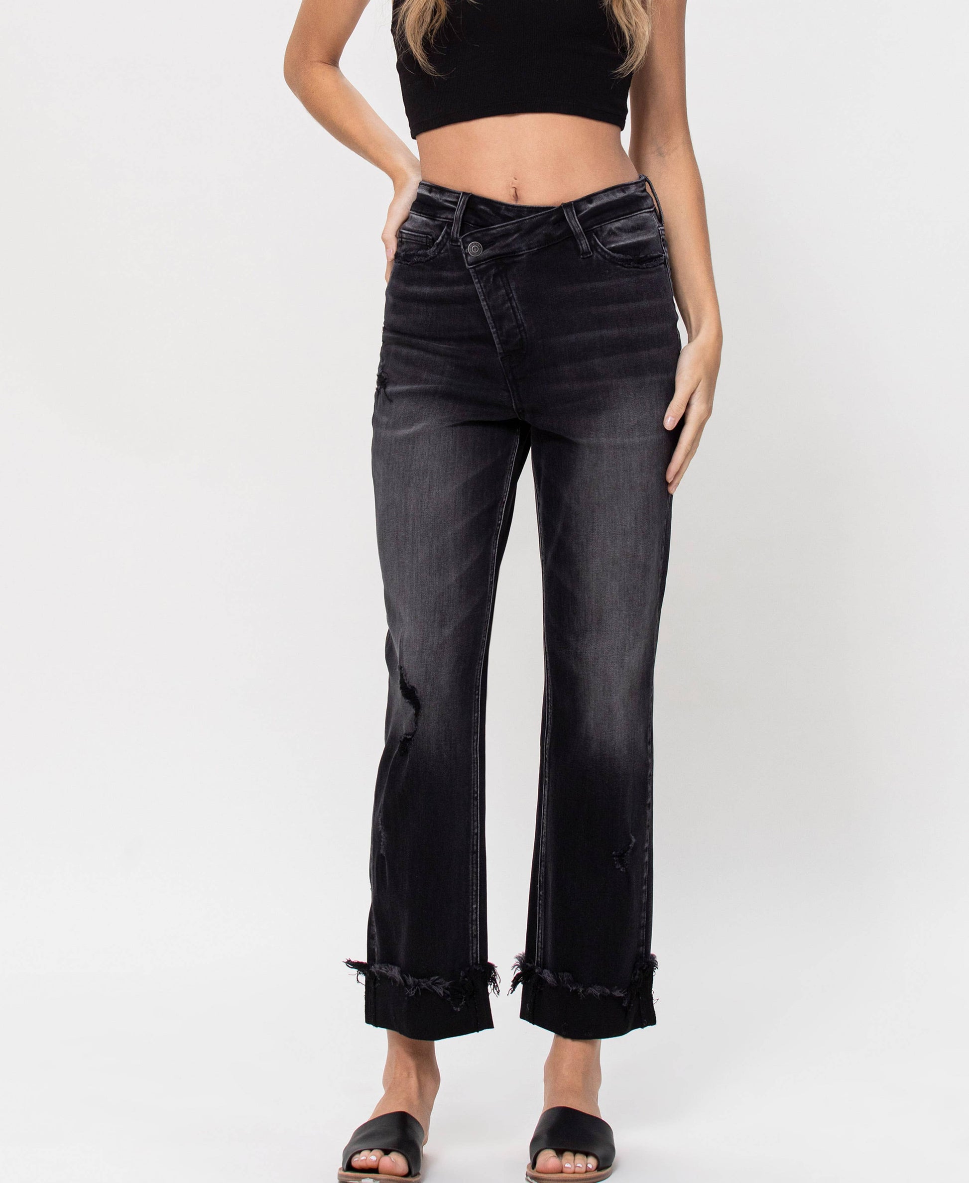 These Super High Rise Button Up Cuffed 90'S Dad Jeans F4558 are crafted with Comfort Stretch Denim, featuring a super high rise waist and an asymmetrical waistband. The button up fly and single cuff hem add a touch of style, while the cropped length and 90's inspired design make them a must-have for any fashionista. With a rise of 11 1/2", inseam of 27", leg opening of 16", and cuff measuring 2 1/2" x 1", these jeans are sure to flatter any figure. Our model, standing at 5'9", is wearing a size 26.